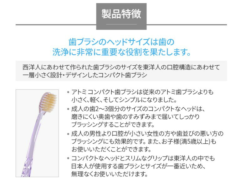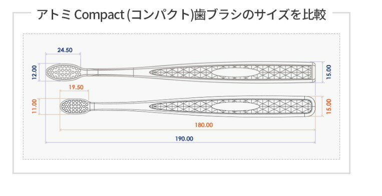 西洋人にあわせて作られた歯ブラシのサイズを東洋人の口腔構造にあわせて一層小さく設計・デザインしたコンパクト歯ブラシ アトミコンパクト歯ブラシは従来のアトミ歯ブラシよりも小さく、軽く、そしてシンプルになりました。