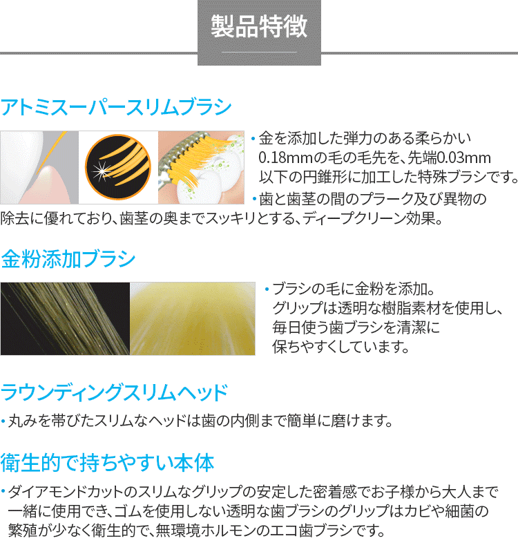 衛生的で持ちやすい本体 ・ダイアモンドカットのスリムなグリップの安定した密着感でお子様から大人まで 一緒に使用でき、ゴムを使用しない透明な歯ブラシのグリップはカビや細菌の 繁殖が少なく衛生的で、無環境ホルモンのエコ歯ブラシです。